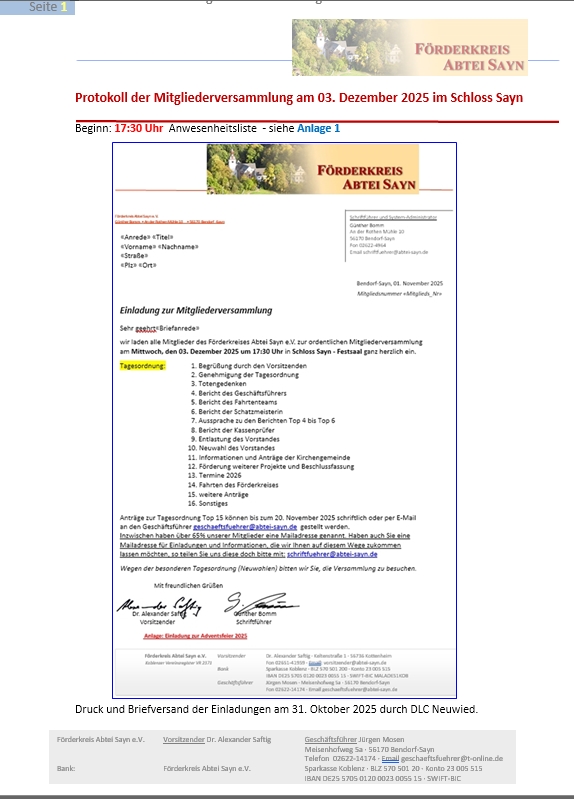 On Thursday, November 9, District Administrator Dr. Alexander Saftig, Chairman of the Sayn Abbey Support Association, opened this year's general meeting punctually at 7 p.m. in the ballroom of Sayn Castle and welcomed the numerous members in attendance. He extended a special welcome to Peter Moskopp (Member of the State Parliament), former Mayor Hajo Stuhlträger, Herbert Speyerer, Father Norbert Maliekal and Mayor Christoph Mohr. He thanked the princely family for making the premises available.