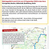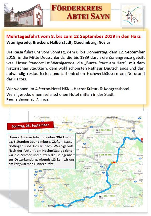 Am Sonntag, dem 8.Sept. 2019, hieß es früh morgens für Mitglieder und Freunde des Förderkreises der Abtei Sayn „Einsteigen“ für eine Fahrt in den Harz. Die Reiseroute führte vorbei an Limburg, Gießen, Kassel nach Wernigerode, wo alle nachmittags wohlbehalten in einem großen örtlichen Hotel ihr Quartier bezogen. Nach der langen Busfahrt kam die Stadtführung in Wernigerode anschließend gerade recht, um sich „die Beine zu vertreten“. Zwei kundige Stadtführer zeigten den Besuchern die „Bunte Stadt am Harz“, den Stadtkern und das wohl schönste Rathaus Deutschlands.Am darauffolgenden Tag stand eine Fahrt mit der dampflokbetriebenen Brockenbahn auf dem Plan. Leider spielte das Wetter nicht mit. Doch man ließ sich die gute Laune nicht verderben – bis - ja bis zu dem Zeitpunkt, als die Bahn nur noch an abgestorbenen Bäumen vorbeifuhr. Alle waren von dem katastrophalen Zustand des Waldes erschüttert. So schlimm hatte sich keiner das Waldsterben vorgestellt. Nach einer fast anderthalbstündigen Fahrt erreichte die Bahn die Endhaltestelle „Brocken“, der inzwischen in tiefe Nebelschwaden gehüllt war. Nur wenige wagten den Sparziergang über den ausgewiesenen Rundweg, der sicherlich bei herrlichem Wetter tolle Ausblicke beschert. Fazit: Tote Bäume, viele Steine, Aussicht keine ! (frei nach Heinrich Heine). Also unterstützte man den Brockenwirt im gleichnamigen Gasthaus durch den Verzehr einer leckeren Brotzeit und fuhr mit der historischen Bahn wieder abwärts.Der dritte Reisetag - von da ab schönstes Wetter - versprach mehrere interessante Ziele. Zunächst fuhr man nach Halberstadt, um die große gotische Kathedrale St. Stephanus zu bewundern. Das beeindruckende dreischiffige Gebäude, mit dessen Bau 1260 begonnen wurde und der Nachfolgebau von zwei älteren Kirchen ist, ist stark an das französische Kathedralschema angelehnt. Große Teile der Innenausstattung, unter anderem ein Lettner sowie viele der bunten Glasfenster; sind im Original erhalten. Quedlinburg mit seinen ungefähr 2000 Fachwerkhäusern und den verwinkelten, kopfsteingepflasterten Gassen war das Ziel zur Mittagszeit. Besonders eifrige Teilnehmer fanden den Anstieg zur Stiftskirche St. Servatius, einem hochromanischen Bauwerk, das in den letzten Jahren sehr aufwendig und detailgetreu restauriert worden war. Leider war die Zeit zu knapp bemessen, um aus den gepflegten Gartenanlagen den Ausblick über die Stadt genießen zu können. Ein weiterer Höhepunkt des Tages war der Besuch der romanischen Stiftskirche St. Cyriakus in Gernrode, wo die Gruppe von einer kompetenten Fremdenführerin durch Kirche und Kreuzgang geführt wurde; einem Kleinod romanischer Baukunst und fachgerecht mit leichtem Anklang an die byzantinische Kirchenkunst restauriert. Im kontrastreichen Programm wurde spätnachmittags der legendäre Hexentanzplatz bei Thale angefahren, dessen grenzwertige Bronzeplastiken zu Recht nicht jedermanns Zustimmung fanden. Die Landschaft hingegen war imposant und reizvoll.Am nächsten Tag lockte die alte geschichtsträchtige Stadt Goslar mit ihrer Kaiserpfalz und vielen anderen Sehenswürdigkeiten. Eine Besonderheit an diesem Tag war dann noch die Fahrt nach Hahnenklee, einem Ortsteil von Goslar. Dort steht die berühmte Stabkirche, Nachbildung eines norwegischen, auch ganz aus Holz kunstvoll gestalteten Vorbildes, einmalig in Deutschland.Der letzte Tag des Harzaufenthaltes war angebrochen. So wurde auf der Rückreise noch ein Zwischenstopp in Fulda eingelegt, um dem Hohen Dom zu Fulda mit dem Grab des Hl. Bonifatius, dem Apostel Deutschlands, einen Besuch abzustatten. Nach einer glücklichen Heimkehr in Sayn verabredete man sich zum Adventkaffee, der am 3. Dez. 2019 um 15 Uhr im Pfarrheim in Sayn stattfindet, wo Bilder von den diesjährigen Fahrten des Förderkreises gezeigt und Erinnerungen ausgetauscht werden können.