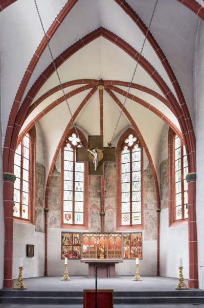 Unter der Vierungskuppel, dort, wo früher vermutlich der Altar des hl. Petrus und des hl. Paulus stand, wurde bald nach dem Amtsantritt von Pfarrer Madauß ein neuer Altar aufgestellt und an Ostern 1971 eingesegnet. Er wurde unter Verwendung eines Kredenztisches aus dem Chor, die aus der Werkstatt Bruells stammen dürfte, durch Restaurator Thienelt aus Koblenz angefertigt. Dieser prächtige vergoldete Altar ist als gut gelungen zu bezeichnen. Wenige Jahre später fand er seinen heutigen Platz im Chorraum (Abb. 1). Das jetzt über dem Altar hängende Kreuz stammt wie das Sakramentshäuschen in der Seitenkapelle und wie das Kreuz über dem Altar in der Seitenkapelle („Werktagskapelle“) von Egino Weinert, Köln. Beim Tieferlegen des Fußbodens kamen im Kirchenschiff so viele gut erhaltene Bodenfliesen des 13. Jahrhunderts zum Vorschein, dass eine Wiederverwendung beschlossen wurde; in der südliche Seitenkapelle bilden sie seit 1993 eine teppichartige Umgebung für die Stele mit dem Tabernakel.