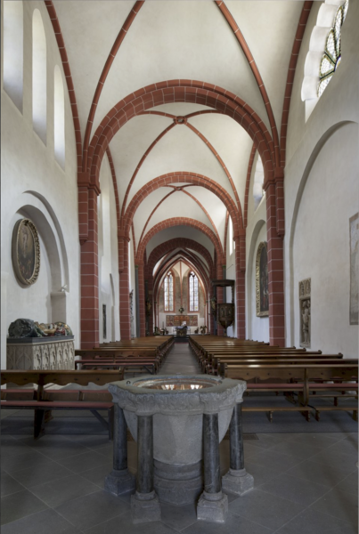 Während der Errichtung der Abteikirche wurde sie mit der etwa 100 Jahre älteren Nikolauskapelle verbunden, die Standort des Taufsteins wurde und den Charakter einer Pfarrkirche („templum parochiale“) erhielt. Nach der Niederlegung der Kapelle im 16. Jahrhundert gab es wechselnde Orte im Kirchenraum für den Taufstein, z.B. im Chorraum und im Seitenschiff (Abb. 2), und nach der Tieferlegung des Fußbodens (1990) fand er Aufstellung Im Eingangsbereich der Kirche (Abb. 3). Dadurch soll symbolisch ausgedrückt werden, dass man durch die Taufe in die Kirche als Gemeinschaft der Gläubigen aufgenommen wird.